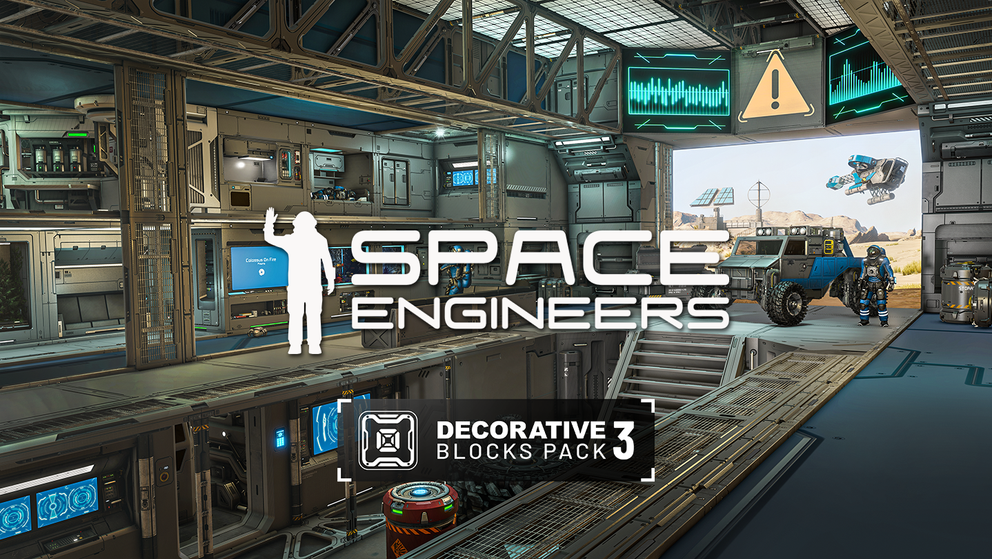 Space Engineers Space Engineers: Decorative Pack #3 includes Warworn Armor Skin, Cab Cockpit, Twin-blade Wind Turbine, Colorable Solar Panels, Holo LCD, Inset LCD panel, Sloped LCD panel, Curved LCD panel, Round Beacon, Inset Couch, Inset Bed, Inset Button Panel, Entertainment Corner, Inset Bookshelf, Inset Aquarium, Inset Kitchen, Inset Cryo Room, Corner Medical Room, Half Bed, Half Bed Open, Scaffold set, Crates & Barrels and Explosive Barrel.