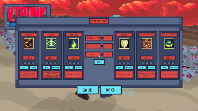 • Fun progression: By playing the game you gain cyber points, you can use these to upgrade your base stats, you can also spend them on cards to permanently have a higher chance to obtain them in your next runs.