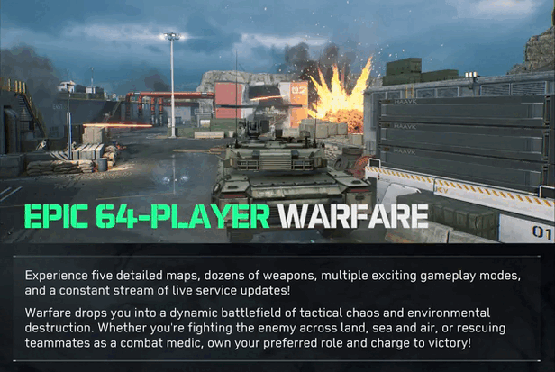- Warfare: battle the enemy across land, sea and air in truly epic 32 v 32 PvP combat, featuring a wide range of vehicles and unique tactical gear.