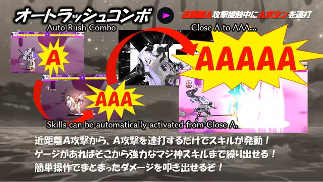 - "Auto Rush Combo" that connects attacks from skills to Magi Kami Skills (super moves) with a series of short-range A attacks!
