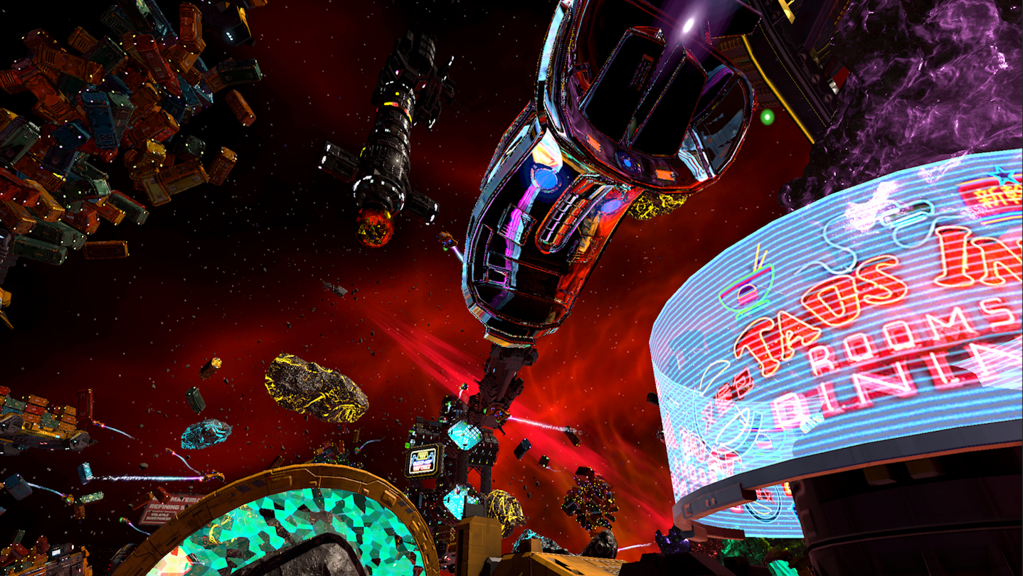 A New Perspective! Experience the visually stunning and stylized universe of Astro Heist, where arcade-style gameplay has you hurtling through a gigantic space outpost, maintaining your cover while completing challenging objectives. The VR player enjoys a diorama-style view into the world, allowing greater oversight of the outpost as they look around the tiny world.