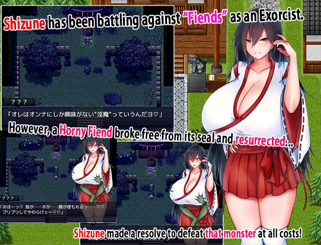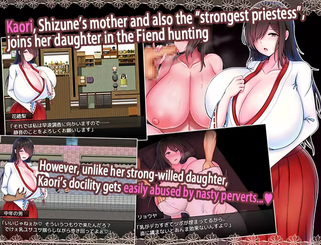 Double-Heroine Exorcist RPG featuring a confident, man-hater heroine Shizune, and her kind, gentle mother Kaori, fighting to purify Fiends and save men who fell under their spells