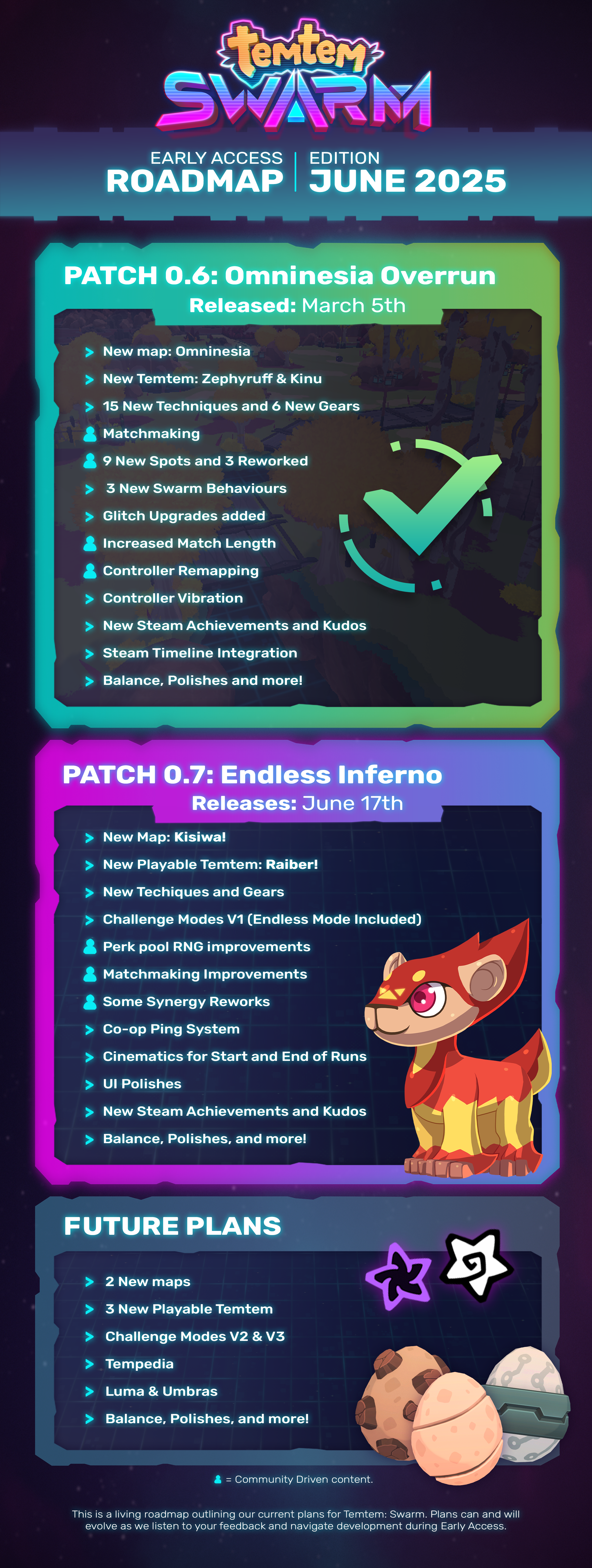 “We value your input and believe that community feedback is essential to shaping the future of Temtem: Swarm. We'll actively engage with the community through our official Discord server, Steam forums, and social media channels. Feel free to share your thoughts, suggestions, and bug reports. Your insights will help us refine gameplay, balance the game, and ensure that Temtem: Swarm is the best possible experience for everyone. Here are some features that have already been added based on player and community feedback: