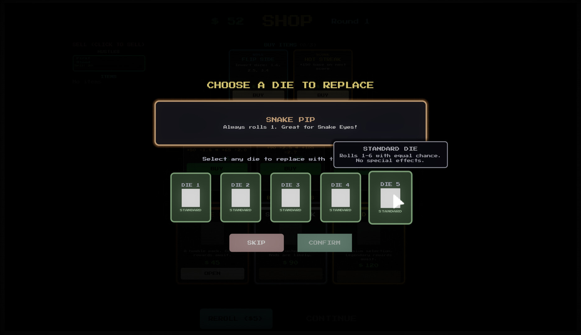 A dice roguelike that fuses craps with deckbuilding. Roll bones, lock dice, score hands like Lucky Seven and Snake Eyes, then stack Hustles until your combos spiral out of control. Every run is a new gamble.