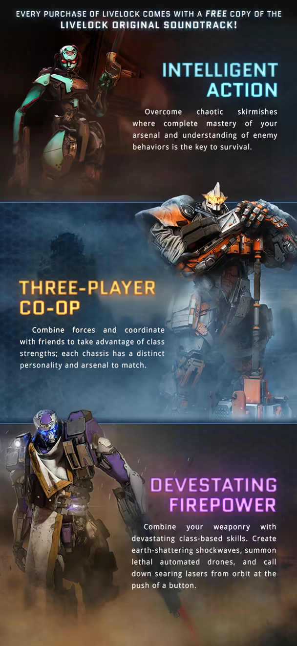 Livelock is a co-operative top-down shooter where you play solo or with up to two allies to break the cycle of infinite war between machines. As one of the remaining Capital Intellects, your role is to unlock Eden and revive humanity.