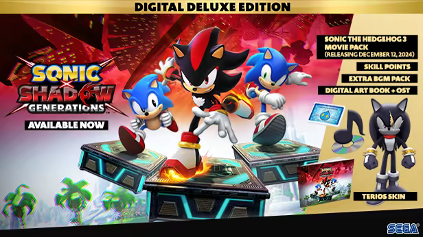 Purchase the SONIC X SHADOW GENERATIONS Digital Deluxe Edition and receive additional iconic music tracks from previous Sonic and Shadow games, a Terios skin based on Shadow’s original concept, behind-the-scenes art, the Sonic the Hedgehog 3 Movie Pack featuring the voice of Keanu Reeves, and more!