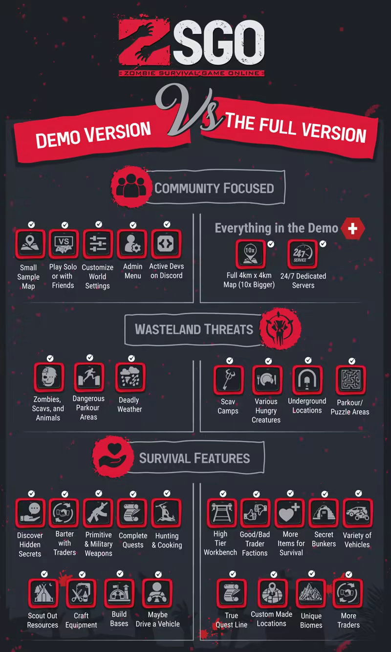 Treacherous landscapes, hidden resources, and untold stories are waiting to be discovered! But remember, you are never safe – stay vigilant and keep your guard up, or risk being consumed by the horrors of the ZSGO Demo…