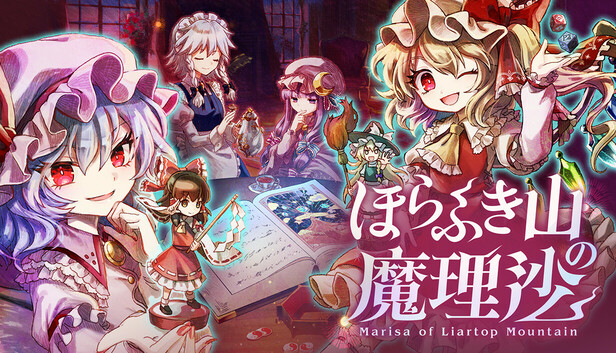 『ほらふき山の魔理沙』は、プレイヤーの選択とダイスの導きで進行するアドベンチャーRPGです。あなたは霊夢となって不思議な本の世界を冒険し、消えた魔理沙を探します。 様々に変化する物語。知恵を巡らせ、運命を支配してほらふき山の真実を解き明かし、魔理沙を救い出しましょう。 ですが、霊夢は一人ではありません。 4人の少女が、霊夢の旅を導き、助け、一緒に楽しんでくれます……遊び半分で!