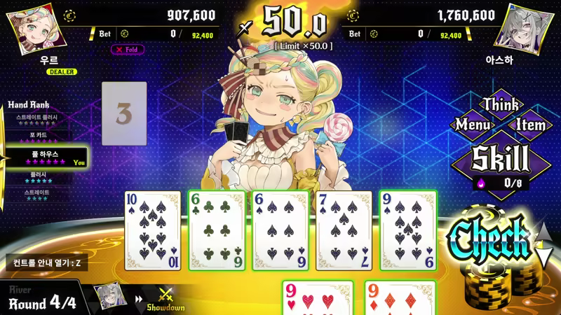 본 작품의 배틀은 텍사스 홀덤을 기반으로 한 뭐든지 다 되는 1대1 포커 라이크 카드 게임입니다.