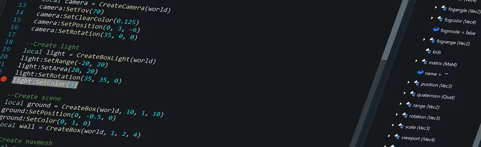 Lua script integration offers rapid prototyping with an easy-to-learn language and hundreds of code examples. The built-in debugger lets you pause your game, step through code, and inspect every variable in real-time. For advanced users, C++ programming is also available with the Leadwerks Pro DLC.