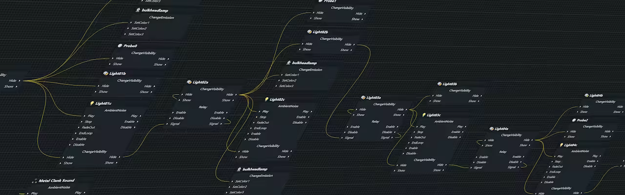 The flowgraph editor provides high-level control over sequences of events, and lets level designers easily set up in-game sequences of events, without writing code.