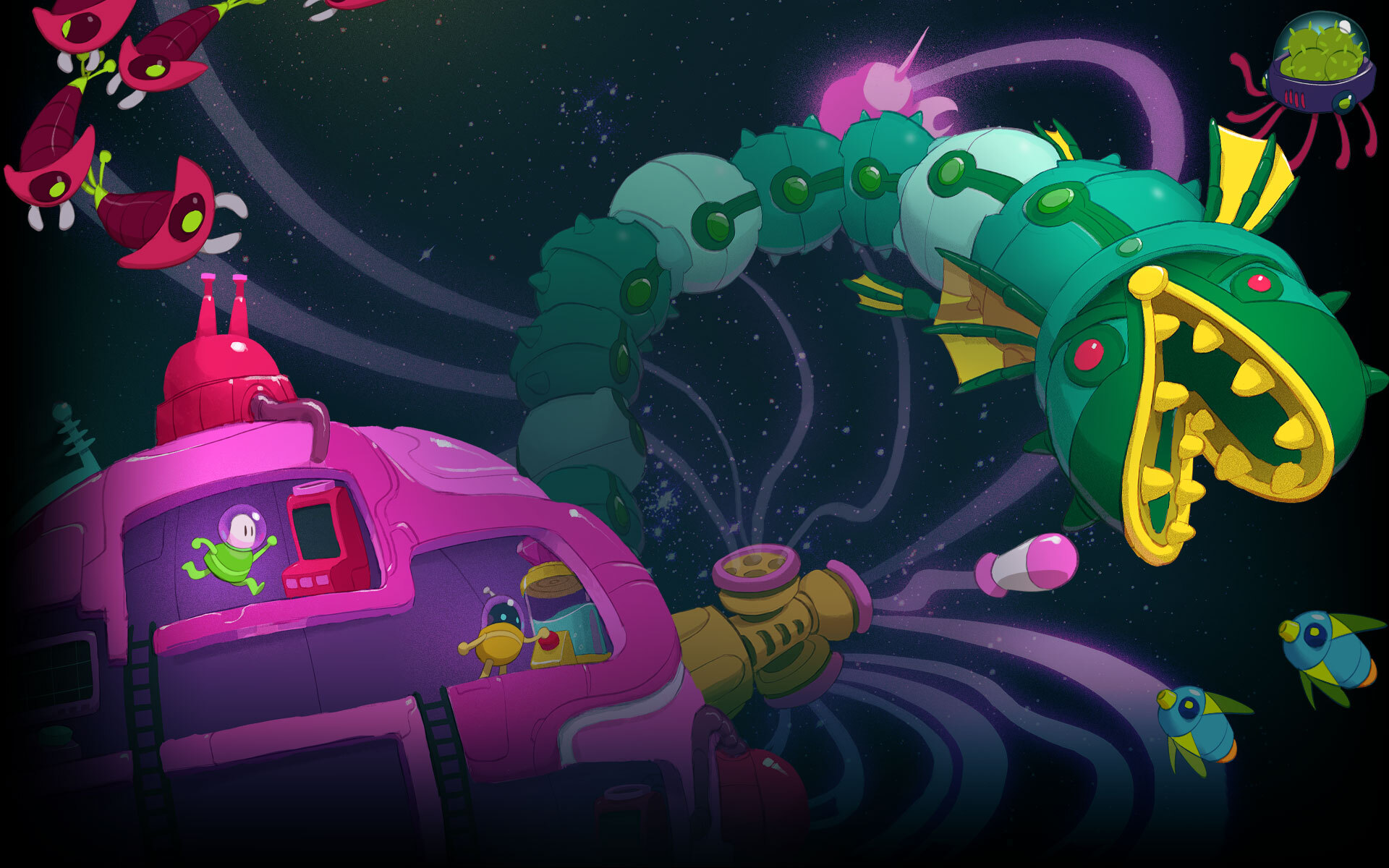LOVERS IN A DANGEROUS SPACETIME is a frantic 1- to 4-player couch co-op action space shooter. Explore a colorful galaxy in a massive neon battleship that you control together by manning turrets, lasers, shields and thrusters. Only through teamwork can you triumph over the evil forces of Anti-Love, rescue kidnapped space-bunnies, and avoid a vacuumy demise. Deep space is a dangerous place, but you don’t have to face it alone!