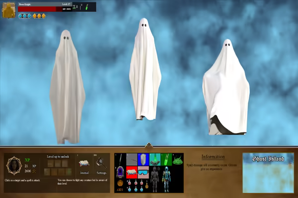 The game takes you around the map in linear fashion battling creatures in an old style point and click RPG adventure experience. With a variety of spells at your disposal, quests to guide the player, and the use of strategy/tactics to defeat enemy types. There are choices on whether to battle creatures based on an integrated health, mana, and experience leveling system. Loot drops at random from creatures allowing multiple battles of the same creatures until possible to move onto the next scenario.