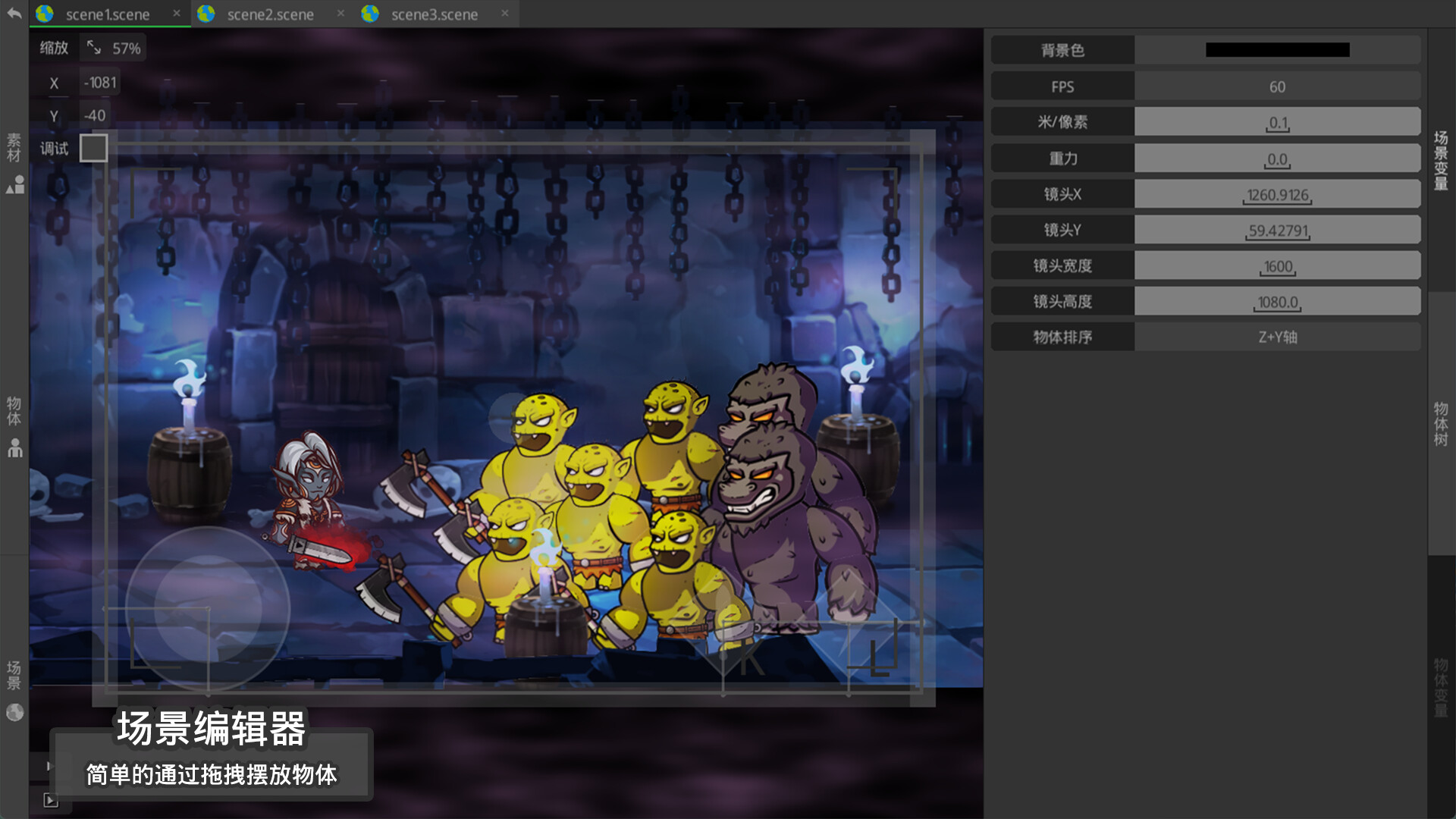 -场景编辑器,最后会用到的编辑器,将您制作的动画&物体放到场景中,点击运行按钮,一款游戏就告制作完成