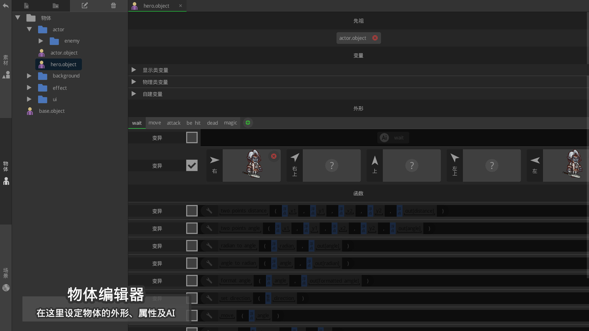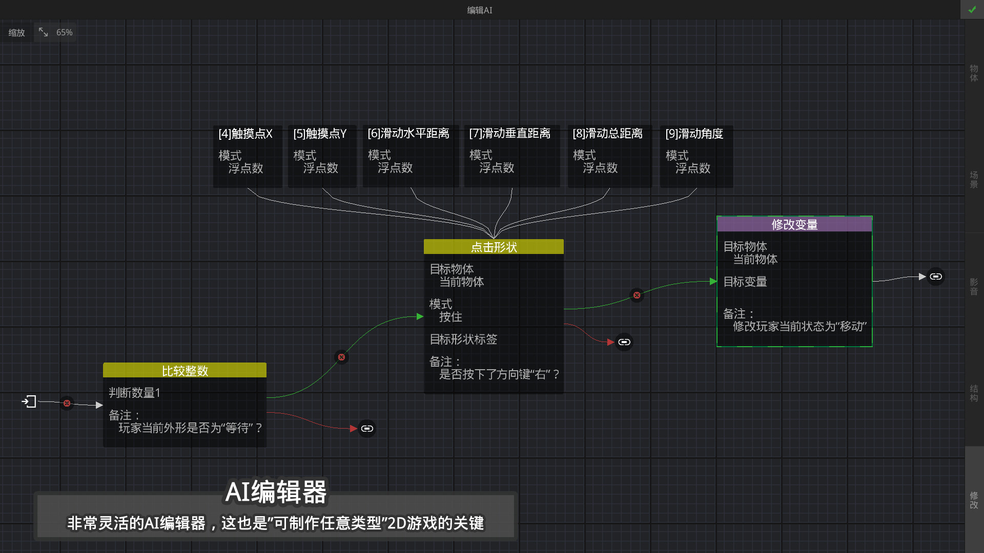 -AI编辑器,如果说上面的功能都是为了制作一款游戏的“皮”,那么AI编辑器就是用来制作游戏的“灵魂”,熟练运用物体AI编辑器后,您可以制作任意类型的游戏及模板