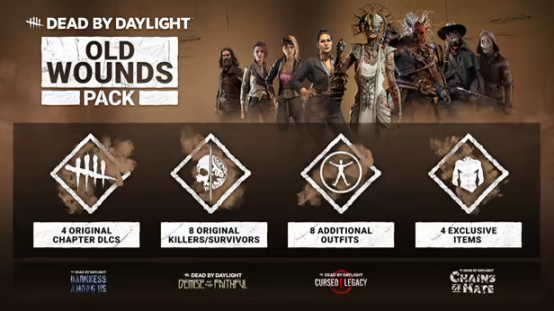 Pain awaits in the Old Wounds Pack, which includes 8 playable characters from 4 of Dead by Daylight’s most unforgiving Chapters yet: Darkness Among Us, Demise of the Faithful, Cursed Legacy, and Chains of Hate.