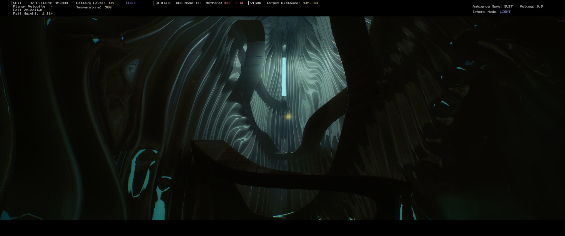 Your suit has O2 filters for breathing, a battery to power it up, and methane for jetpack fuel. Balance them to avoid the inevitable and find resources on the planet to restore and upgrade your suit. Also, control a set of sound- and music-related functions.
