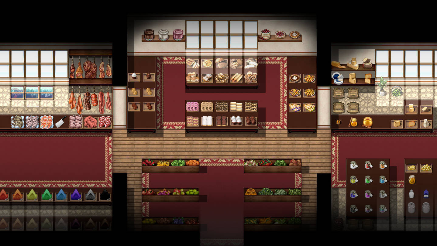 Does your fantasy RPG village need a bigger marketplace? This interior tileset for RPG Maker has veggies, baked goods, butcher shop and more, with plenty of tiles to make a variety of small fantasy stores!