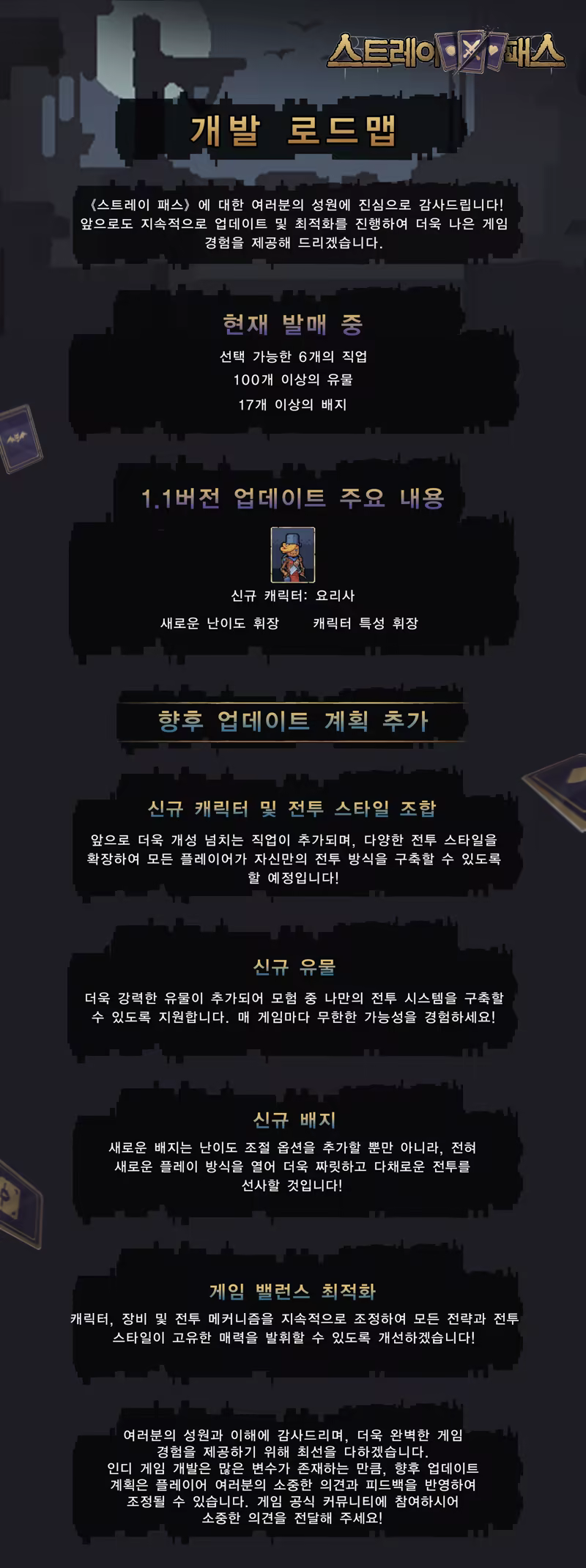 "스트레이 패스"는 로그라이크 형식의 카드 빌딩 게임입니다. 매번 게임을 할 때마다 무작위로 생성된 미지의 세계에서 진실을 찾기 위해 다양한 캐릭터를 선택하게 됩니다. 당신의 모든 선택을 잘 활용하세요. 카드나 장비를 장착하는 것은 당신의 선택에 달려 있습니다. 마치 프리셀처럼 카드를 이동하실 수 있습니다. 게다가 아이템 카드 두 장을 선택하여 배낭에 저장할 수도 있습니다. 설렘과 놀라움으로 가득한 여정에서 잃어버린 세계의 종점에 도달하세요!