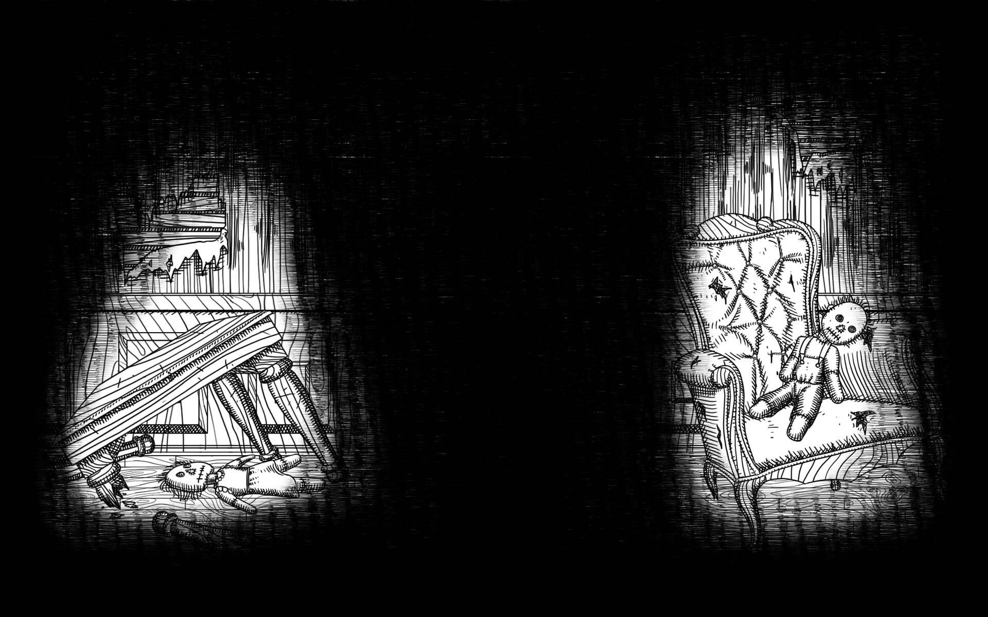 • Black and white artwork creates a distinctive moody and dark atmosphere.