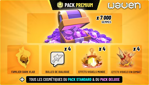 * Les Gemmes sont une monnaie dans le jeu qui vous permet de débloquer des éléments cosmétiques dans Waven. Utilisez-les afin de déverrouiller des apparences pour vos héros, votre havre-île ou votre bateau, mais aussi pour débloquer des effets visuels, des emotes ou des bulles de dialogue afin de personnaliser votre aventure dans le Monde des Douze.
