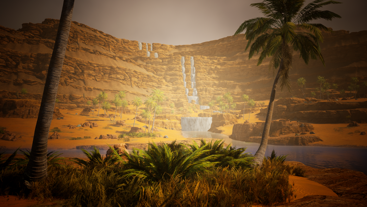 • Twin waterfalls cascade down the cliffside in the north across sand and rock, with room to center your base around them