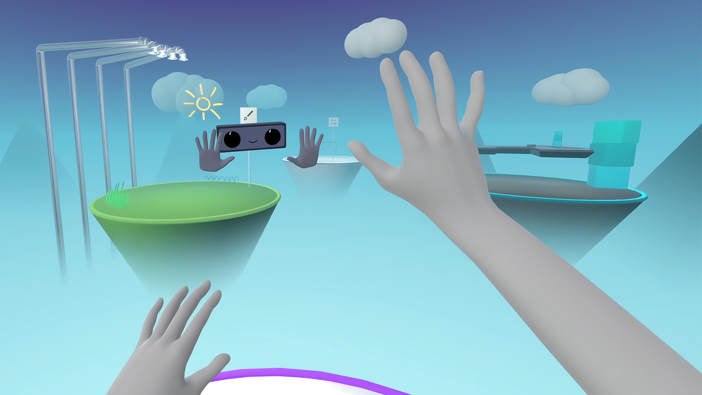 Aurora is a virtual space created by Ultraleap – it contains islands where each hosts a different experience for you to explore. Follow our tutorials which will show you how to navigate around the space without having to physically move yourself, and learn how to use your hands by imitating our ghost hands.