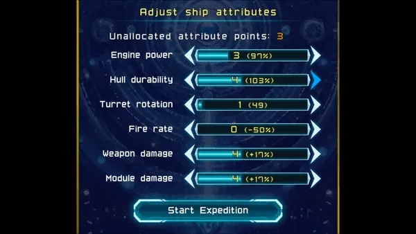 Upgrade Ship during Expedition: install researched weapons, modules, modifications. Change basic aspects (attributes).