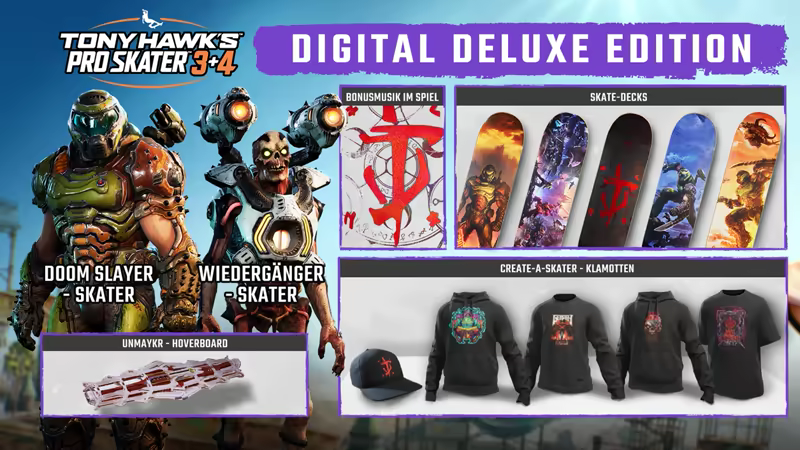 • Die spielbaren Skater Doom Slayer und Wiedergänger, die je 2 geheime Moves beherrschen. Für den Doom Slayer sind außerdem 2 einzigartige Outfits und das Deck 'Unmaykr-Hoverboard' enthalten.