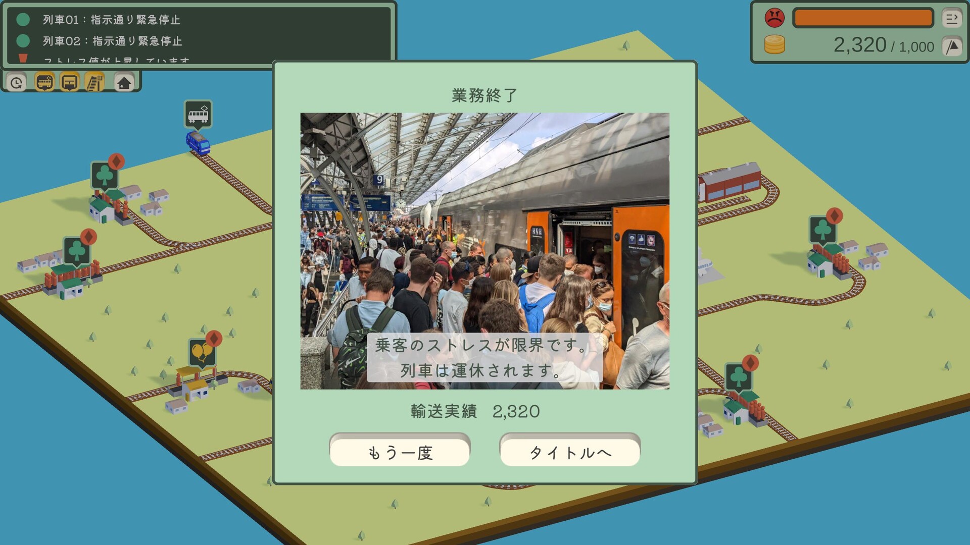 Railway dispatching is a puzzle that never stops moving. Direct trains and transport a growing number of passengers in this real-time railway strategy game. Select a train, choose its destination, secure equipment with freight trains, and prevent collisions and passenger stress.