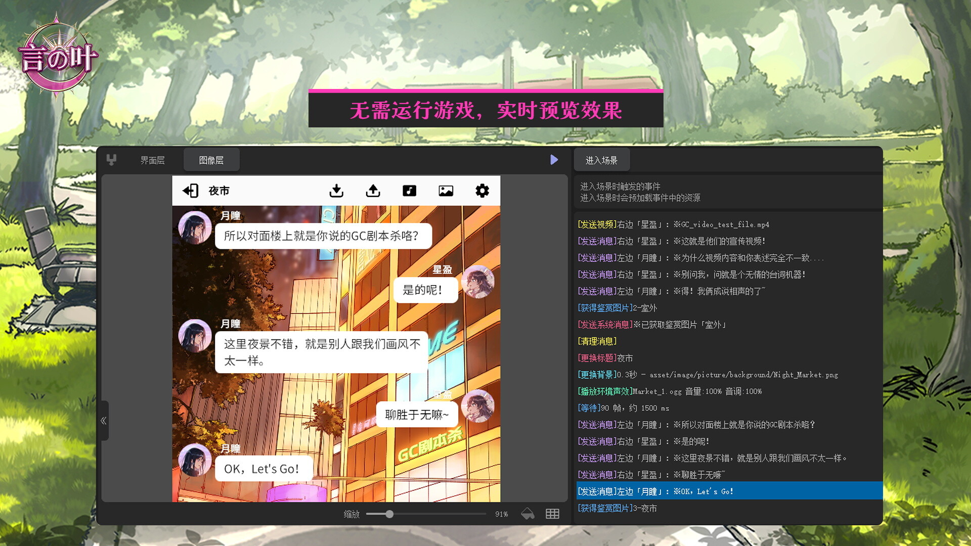 该模板是GameCreator官方出品的游戏模板-言之叶。可用于可视化制作聊天软件式的对话小说游戏。