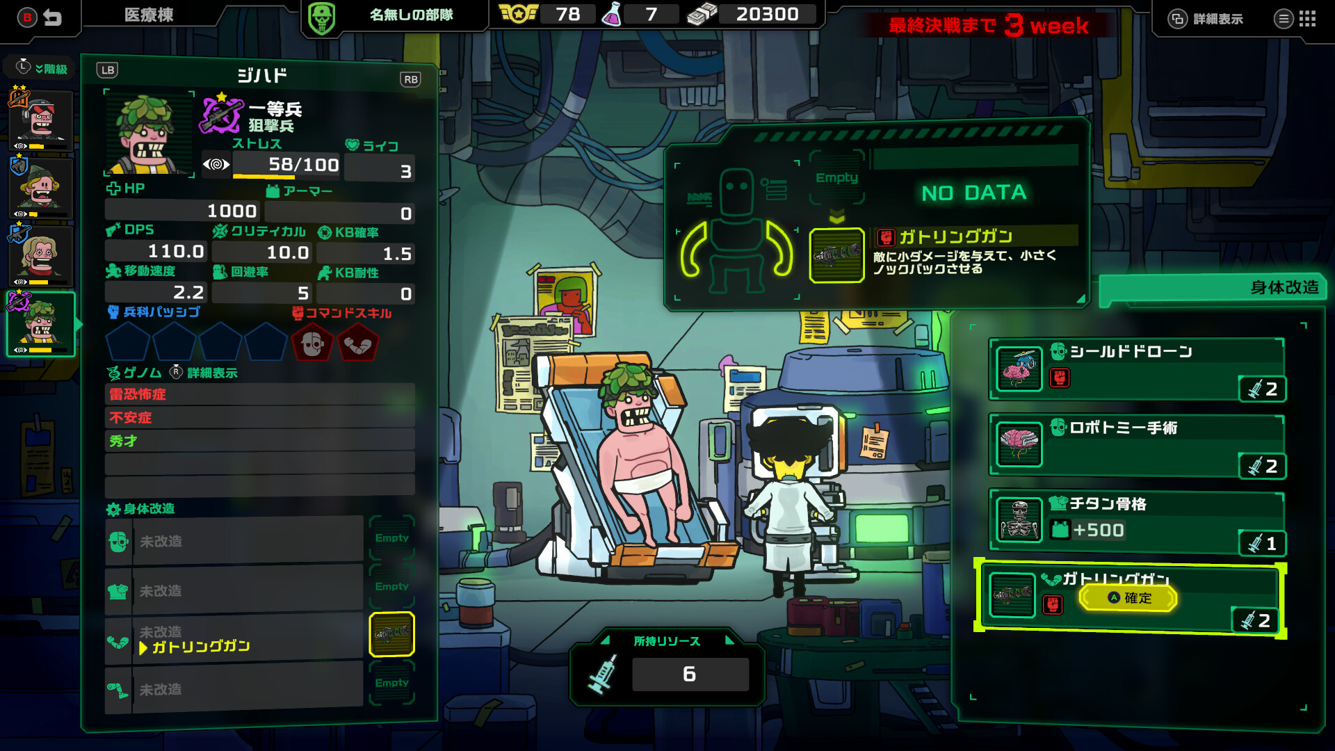 Soldiers will strive to gain more power by acquiring skills through training. They can also mod their bodies to achieve a kind of power that no human could ever hope for. But keep in mind... Inhumane powers means an inhumane mind. Can you sacrifice your troops' dignity to victory?