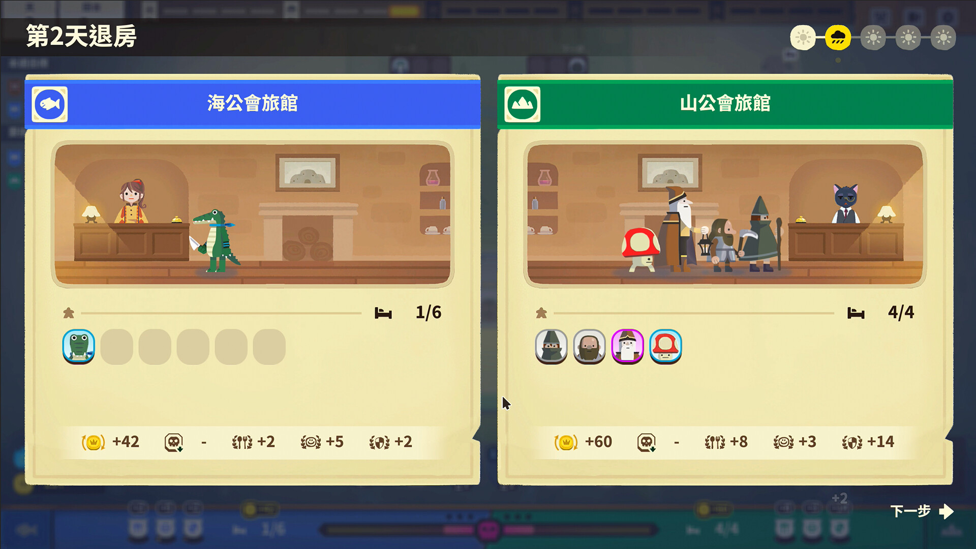 走過路過,不要錯過!為了吸引更多客人光臨你的旅館,你可以放置廣告牌、小吃攤、能量飲料、轉盤等來贏得各路冒險家的心。但你也需要掌握好時機,不要讓兩個公會的冒險家們在旅館前相遇。有時讓他們就地休息一回合,也是一個不錯的策略~