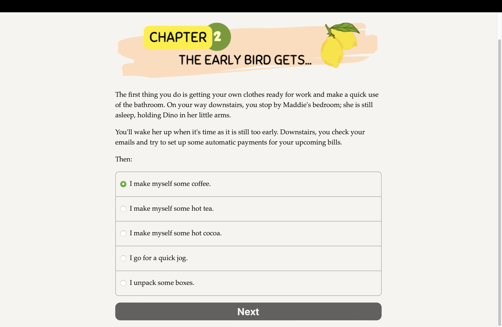 When Life Gives You Lemons is an engaging and heartwarming 300,000-word romantic slice-of-life interactive novel by C.C. Hill, where your choices control the story. The game is text-based, with optional character artwork that you can toggle on and off.