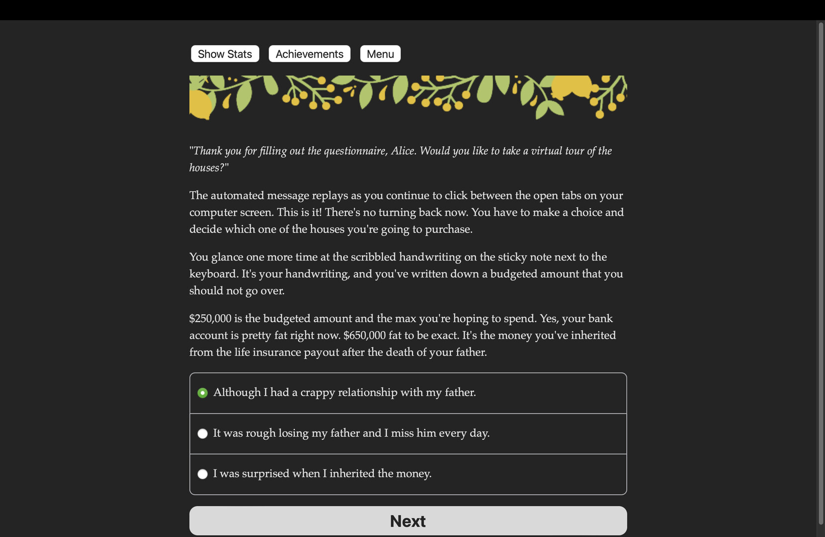 When Life Gives You Lemons is an engaging and heartwarming 300,000-word romantic slice-of-life interactive novel by C.C. Hill, where your choices control the story. The game is text-based, with optional character artwork that you can toggle on and off.
