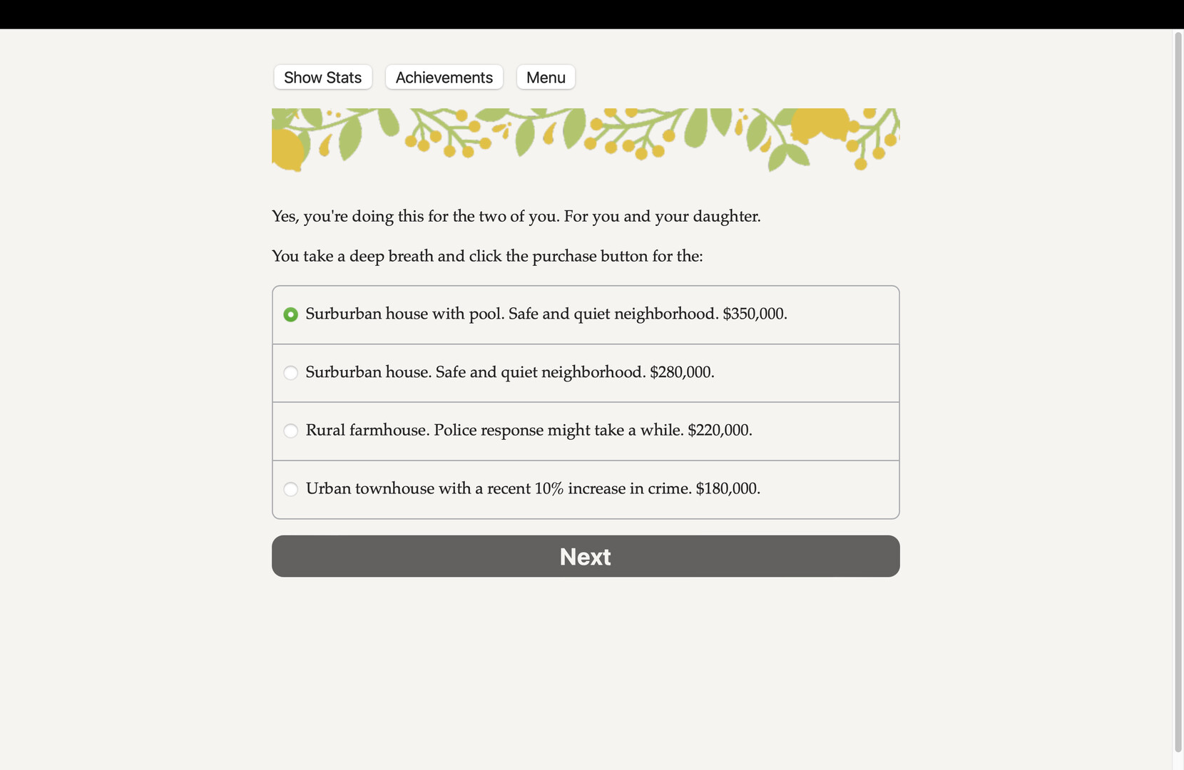 When Life Gives You Lemons is an engaging and heartwarming 300,000-word romantic slice-of-life interactive novel by C.C. Hill, where your choices control the story. The game is text-based, with optional character artwork that you can toggle on and off.