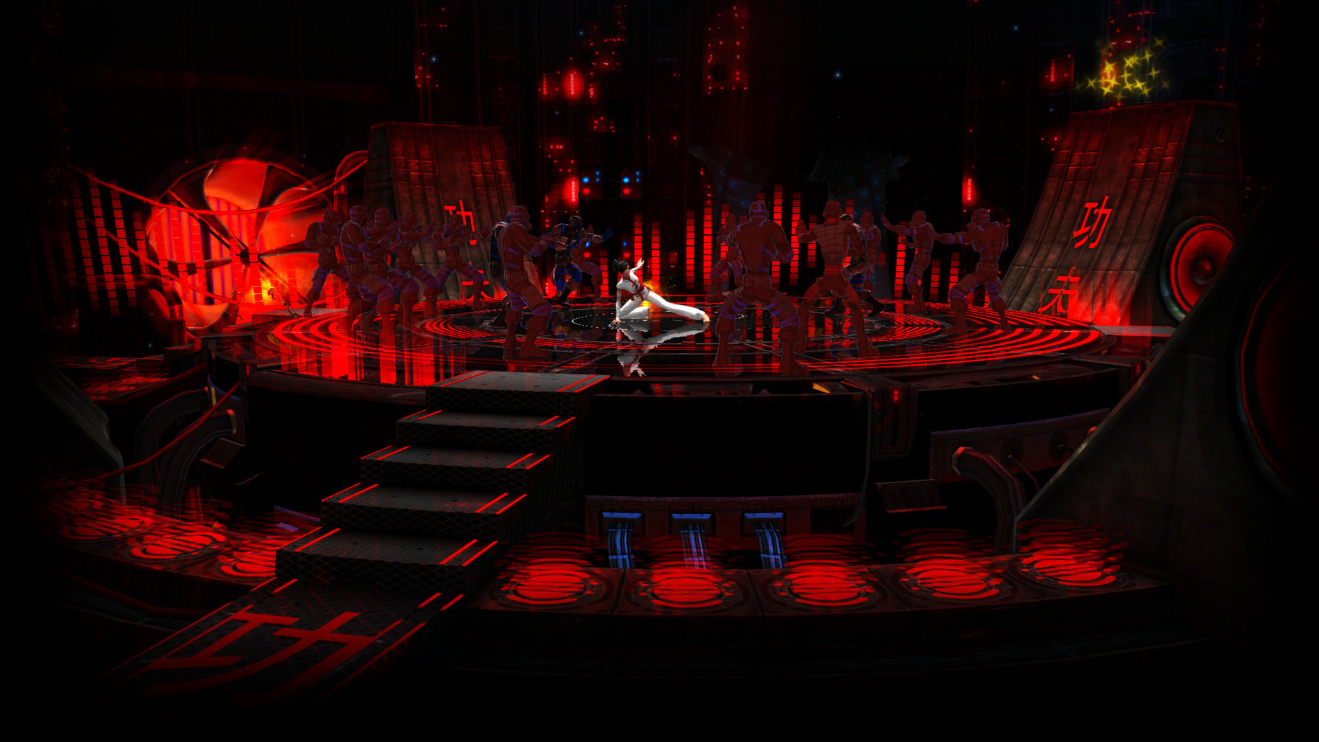 We got rid of the bars, arrows, button icons, etc. that other music games rely on as action cues and replaced them with fully 3D animated characters. Instead of just seeing characters in the background moving to a preset script as eye candy while the actual gameplay takes place in an abstract 2D interface, you actually control and react to those 3D characters. That means you actually get to focus your attention on what those characters are doing! As you play the game, you're creating your own fight sequence with your button presses. We also let you get rid of all the other interface parts (such as score) if you like, so that there are no distractions from the action.