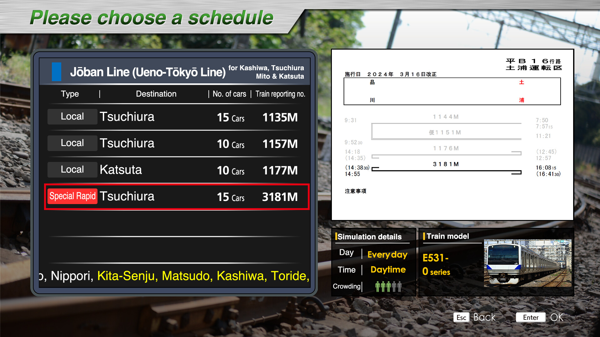 This DLC includes the Ueno Tokyo Line between Shinagawa Station and Ueno Station and the Joban Line between Ueno Station and Katsuta Station.