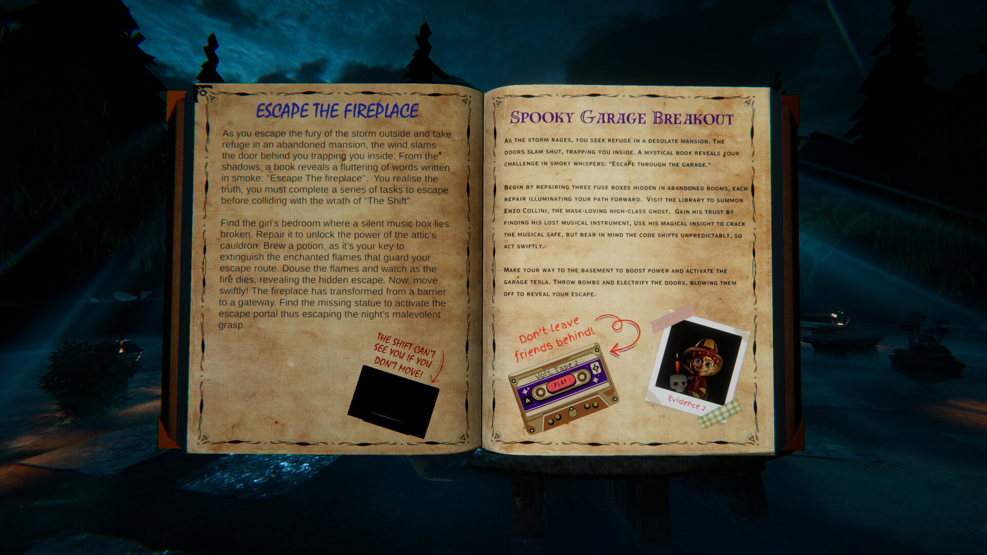 Imagine: Teaming up with your friends for an adventure, you're a group of childhood heroes, exploring various locations and discovering danger. From a haunted mansion to a spooky carnival, unpredictable at every corner. But this isn't your typical hide-and-seek. Channel the powers of your alter egos. Whether that's a heroic firefighter, mastermind lockpicker, insightful psychologist, or the resourceful inventor. Pull on their abilities to survive the night. What's the catch? The dark entity known as "The Shift" is on your tail as you try to find your way out, and this entity plays for keeps.
