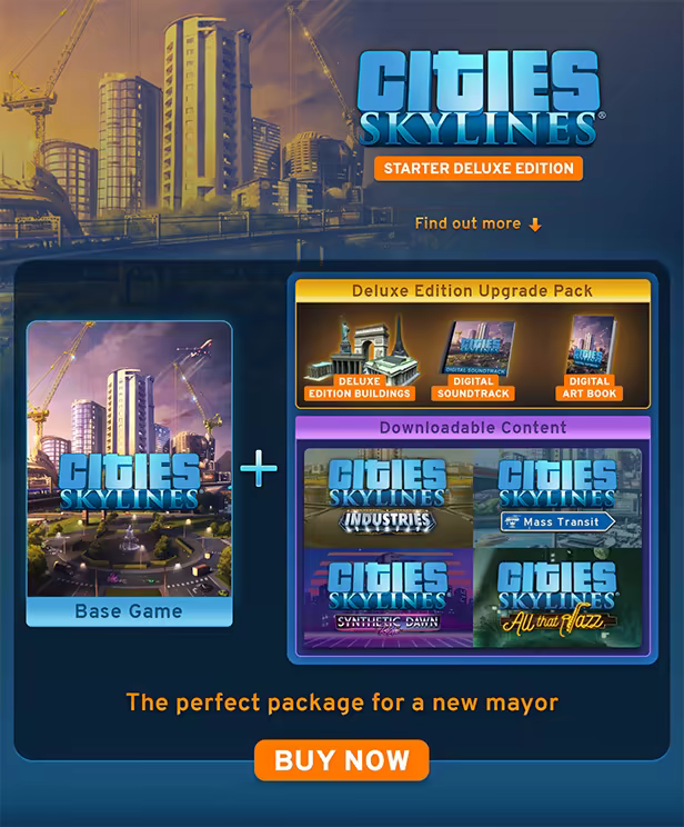 Set up your city building experience for success with the Starter Deluxe Edition. This package gives you the most popular starter DLCs as a groundwork for a thriving metropolis. And not to forget, with some good vibes in the background.
