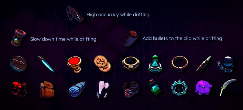 While moving at max speed you reflect bullets and can slam into enemies. Blow back from your weapons can be used to increase your speed, Hook shots can be fired to quickly ram enemies, Various special effects are triggered by drifting depending on what Relics you choose to equip