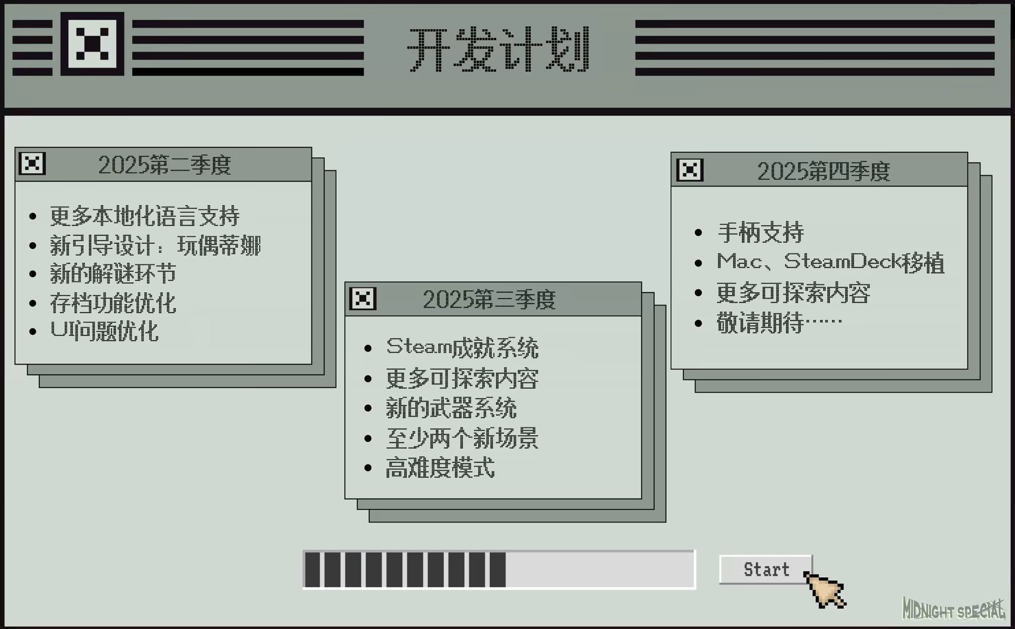 “完整版将包含更多内容,如更加精细的美术资源和交互设计、更多对话文本、更多语言本地化支持,以及轻量化的战斗机制——这些在抢先体验版发布时尚未能实现。开发团队计划发布开发路线图,并计划定期更新,同时尽可能整合玩家社区的反馈意见。目前发布的版本被称为“序章”(The Pilot),它为主线故事奠定了基础,并为系列后续章节做好了铺垫。”