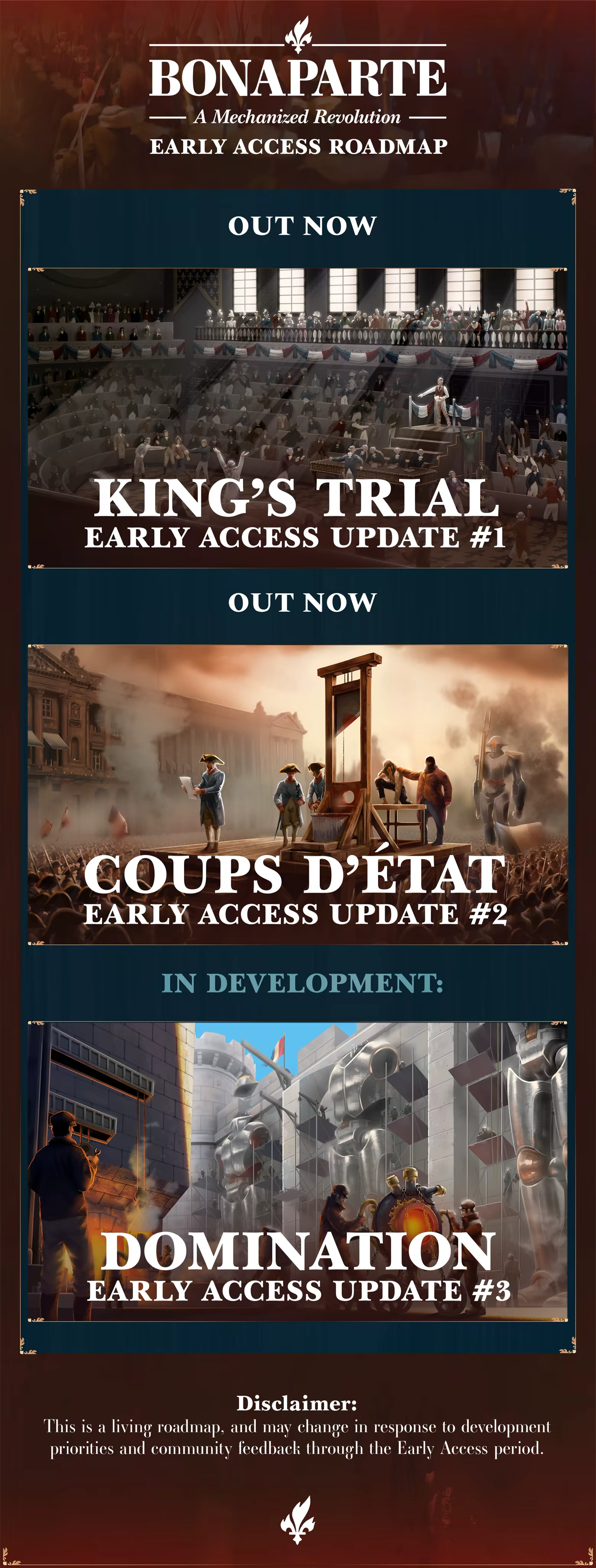 “The Early Access build is similar to a beta build. Most of the features and content will be available right away, allowing you to rewrite the Revolution the way you want. You will be able to side with any of the 3 factions, gain political power by leveraging the National Convention, or use propaganda to influence select social classes to gain seats in the next elections. And of course, you will be able to improve your infrastructures and recruit new battalions, Colossi, and officiers to lead them into battle.”