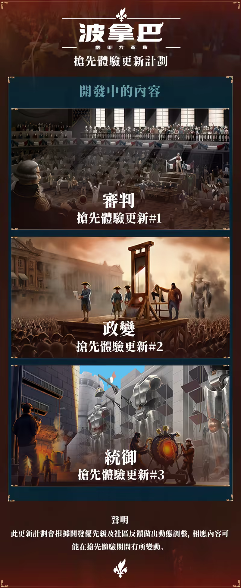「搶先體驗版本將提供全程可玩的遊戲體驗,我們計劃在1.0版本拓展政治系統,增加新的戰鬥地圖和單位。同時改善遊戲穩定性和平衡性,優化性能表現。最重要的是,搶先體驗讓我們有機會直接和玩家溝通,共同打造心目中最棒的策略遊戲。 請注意搶先體驗版本只支持英、法雙語,更多語言支持(包括中文!)將在1.0正式版本中推出。」