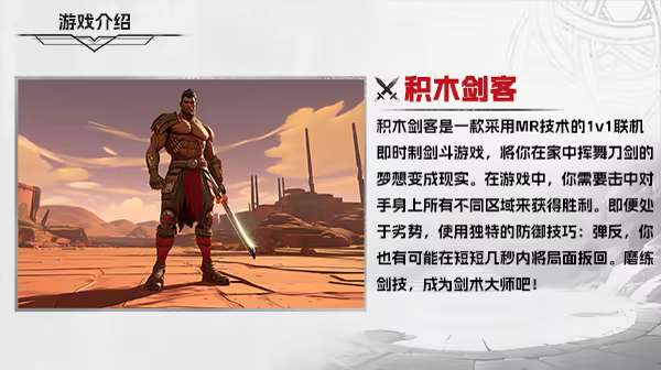 《积木剑客》是一款多人在线即时制剑斗类VR游戏,拥有创新性的击杀判定系统——击溃敌人的身体“积木”。打造了独特而前所未有的游戏体验,让你在家挥舞利剑的梦想变成现实!