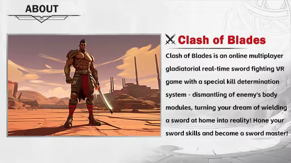 Clash of Blades is an online multiplayer gladiatorial real-time sword fighting VR game with a special kill determination system - dismantling of enemy's body modules, creating a unique and groundbreaking gaming experience, and turning your dream of wielding a sword at home into reality!