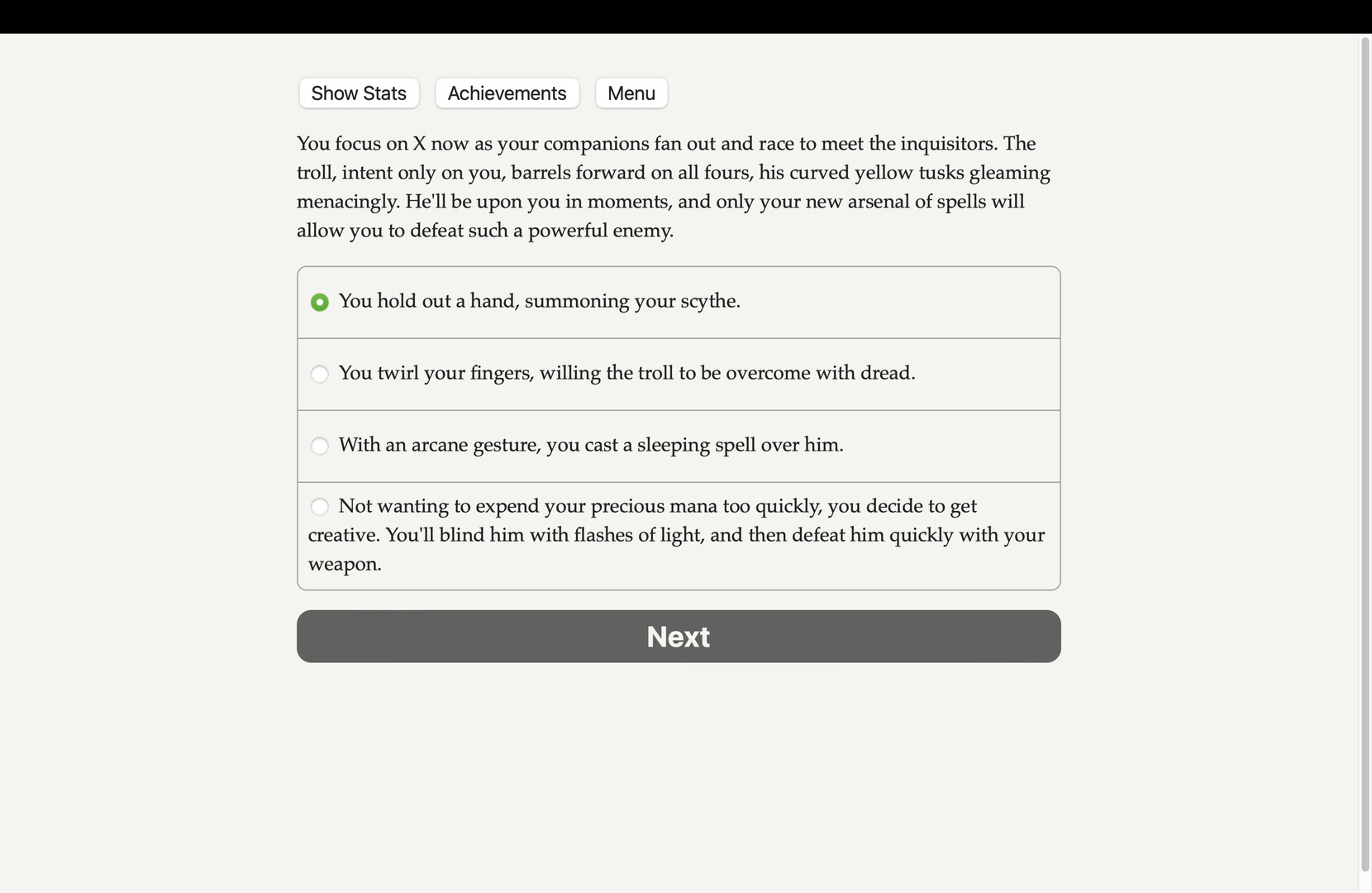The Nascent Necromancer is an epic, 238,000 word interactive fantasy novel by Samwise Harry Young, where your choices control the story. It's entirely text-based, and fueled by the vast, unstoppable power of your imagination.