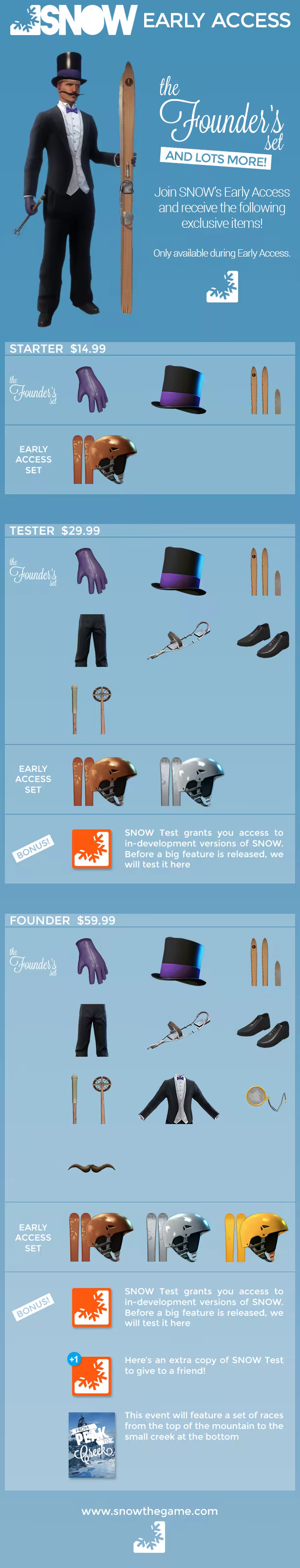 Until SNOW goes free-to-play, users will be required to purchase access to the game. There are several options for players who want to support the game's development and receive exclusive content in return.