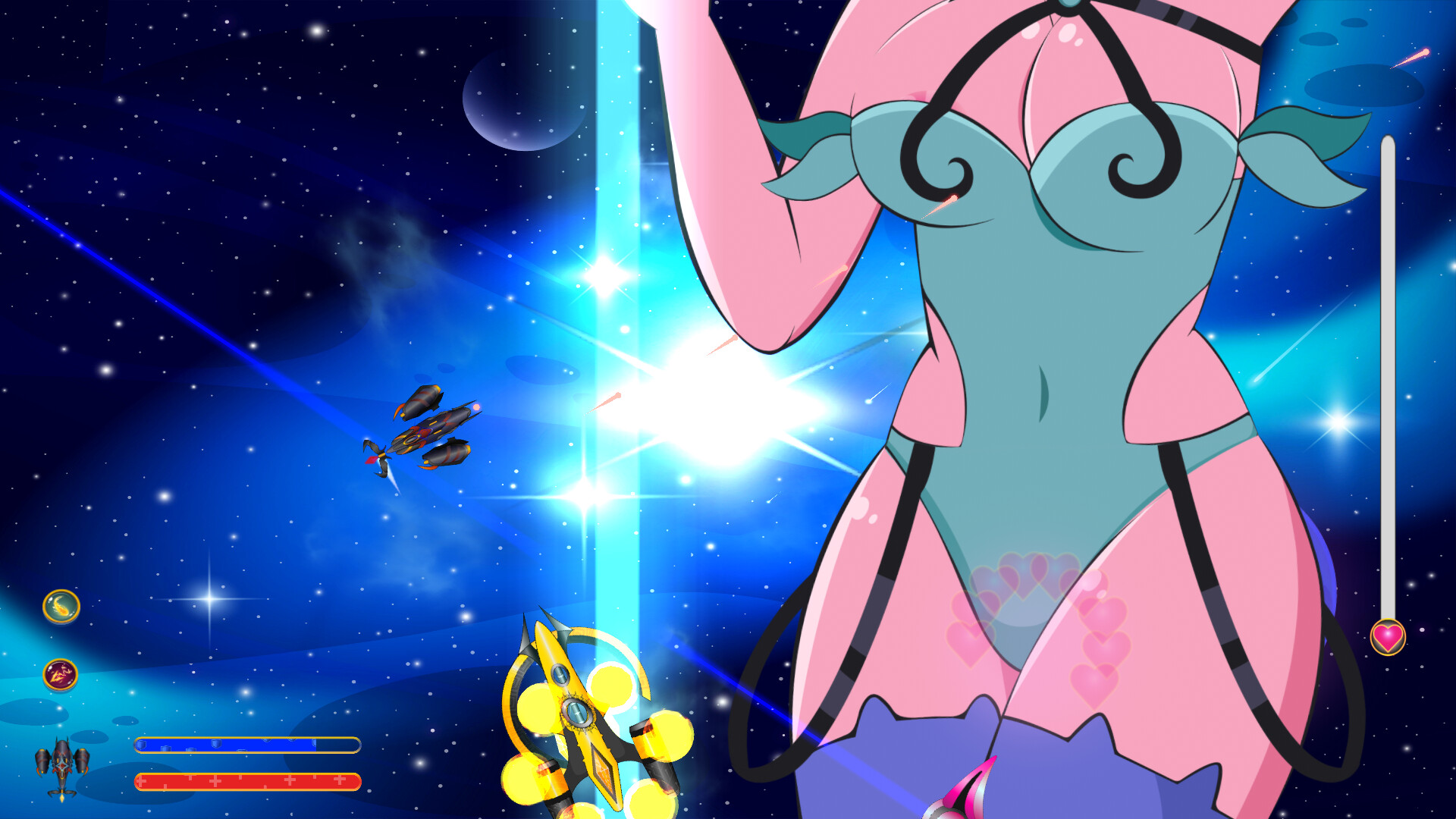 Help Dux save our solar system and learn more about the STELLAE in this adventure with elements of "BULLET HELL" laden with eroticism nd learn more about the STELLAE, discover why planets are not just rocks, and why their beauty is legendary!