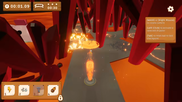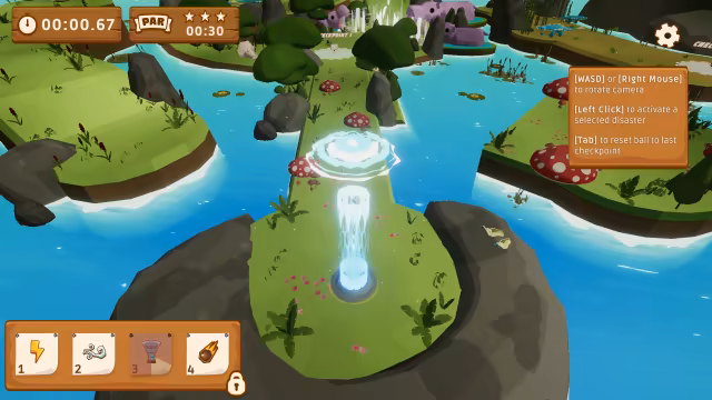 Fast-paced golf! No need to wait for your ball to stop moving - hit it again as soon as you can. Disaster Golf is all about speed and getting the ball into the hole as fast as possible using any means available. Combine your natural disasters to get the fastest time!